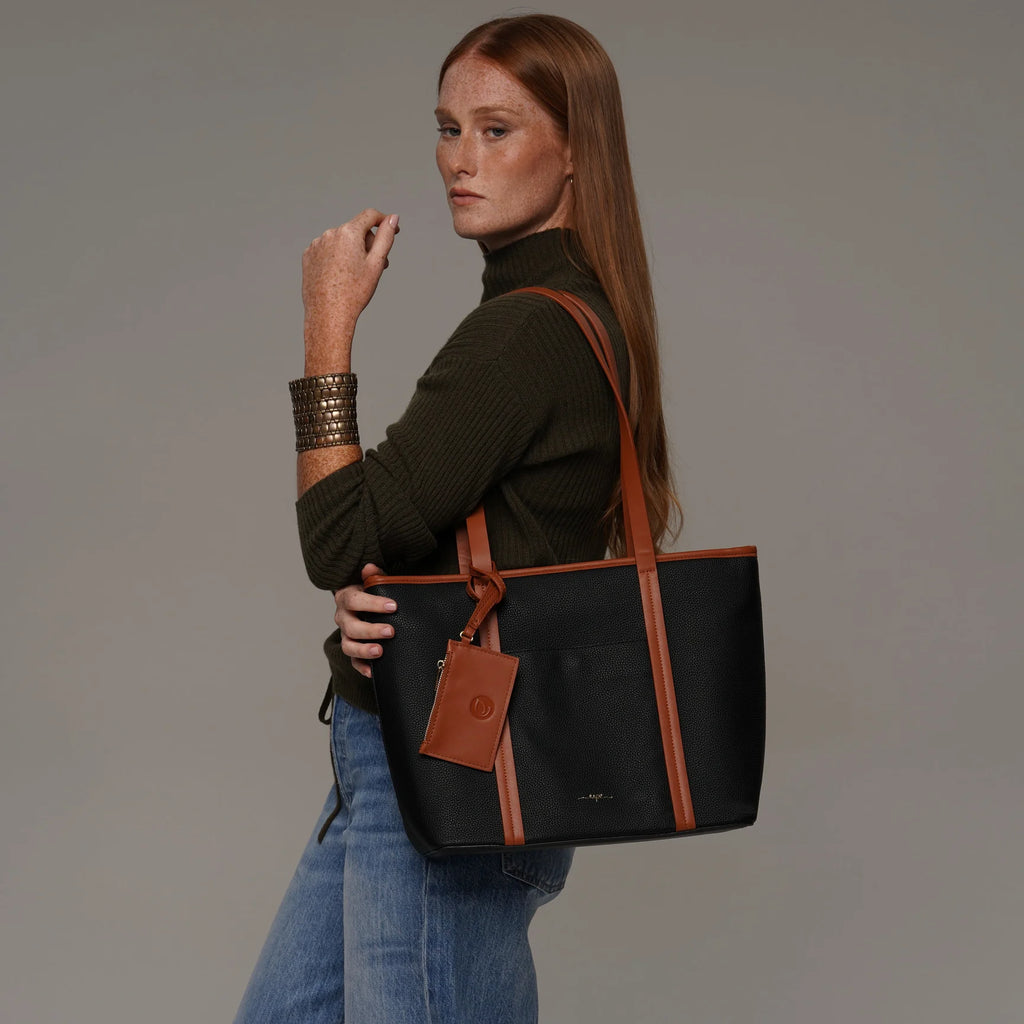 The Juliette Tote exemplifies refined functionality with its thoughtfully designed padded compartment accommodating a 13" laptop. Meticulously crafted from textured, cruelty-free vegan leather, this capacious accessory offers abundant storage while maintaining an elegant silhouette. Its versatile design transitions seamlessly from professional engagements to daily excursions with distinguished ease.