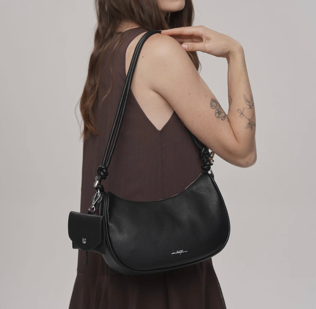 The Nadine is an on-trend, easy crescent-shaped bag featuring a smooth sliding adjustable strap for effortless wear. Crafted in Toronto from soft pebbled vegan leather, it includes super cute knot details on the strap for a stylish, modern look. The Nadine also comes with a mini pouch — perfect for your AirPods, bus pass, or small essentials. Lightweight, versatile, and fashion-forward, it’s the ideal vegan leather crossbody for everyday style.