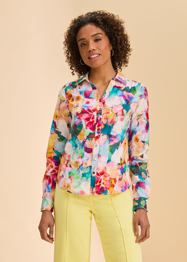 FDJ - STEPHANIE STRETCH POPLIN SPLIT NECK LONG SLEEVE SHIRT - 7242623